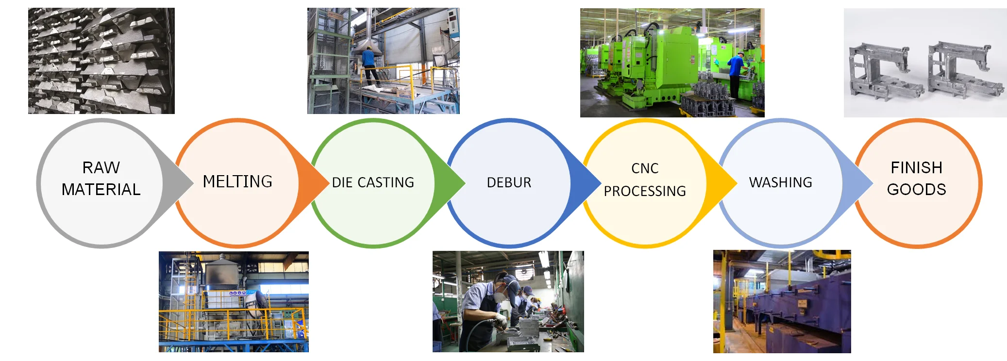 Product Quality Assurance – Precision & Reliability: Our advanced precision die-casting technology ensures consistent, high-quality production with strict process control at every stage. We utilize state-of-the-art automated equipment such as Toshiba and Toyo die-casting machines, LPG-fueled melting furnaces, and an automated track system for optimized efficiency. With rigorous quality checks throughout the production line, we guarantee that every product meets customer specifications and industry standards